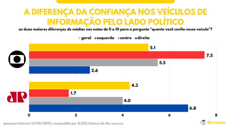 Os veículos que mais fazem as duas pontas divergirem são a Jovem Pan, com um gap de 5,1 pontos a mais de confiança da direita (E: 1,7 | D: 6,8) e a Globo, com um gap de 4,9 pontos a mais de confiança da esquerda (E: 7,5 | D: 2,6).