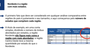 O primeiro slide, por exemplo, mostra que o Nordeste é a região com mais estados, por isso teria mais ônibus fiscalizados, no total de 322 veículos, ante 65 da região Sul.