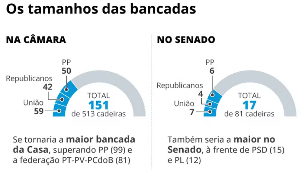 Ter a maior bancada é importante, por exemplo, para ter preferência na hora de dividir o comando de comissões. Pelas regras internas das duas casas legislativas, o maior partido — ou maior federação — pode escolher primeiro com qual quer ficar. Além disso, o bloco de legendas, uma vez unido, teria mais chances de eleger os sucessores de Arthur Lira (PP-AL), na presidência da Câmara, e de Rodrigo Pacheco (PSD-MG), na do Senado.
