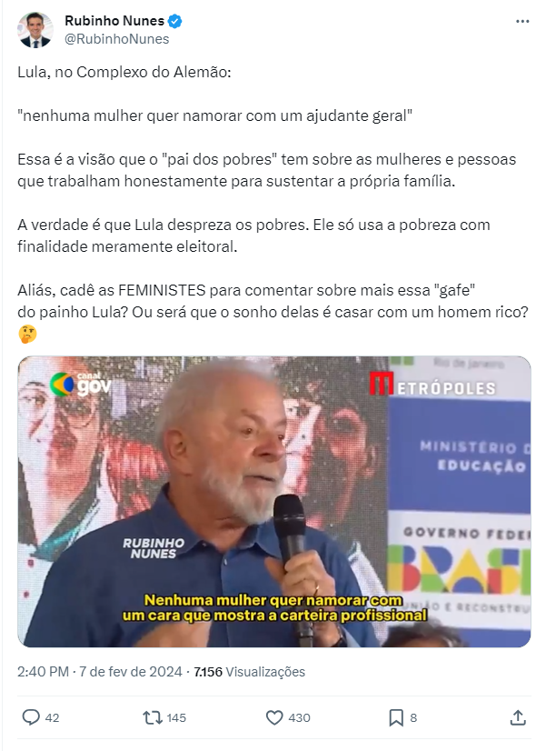 – Lula, no Complexo do Alemão: “nenhuma mulher quer namorar com um ajudante geral”. Essa é a visão que o “pai dos pobres” tem sobre as mulheres e pessoas que trabalham honestamente para sustentar a própria família. A verdade é que Lula despreza os pobres. Ele só usa a pobreza com finalidade meramente eleitoral – escreveu Rubinho.