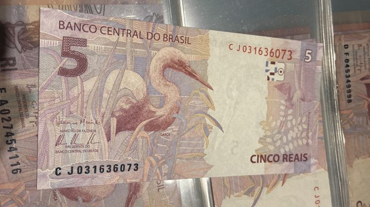 Como exemplo, há uma cédula de R$ 5, cuja série inicia com “CJ”, contendo a assinatura do ministro Henrique Meirelles.
