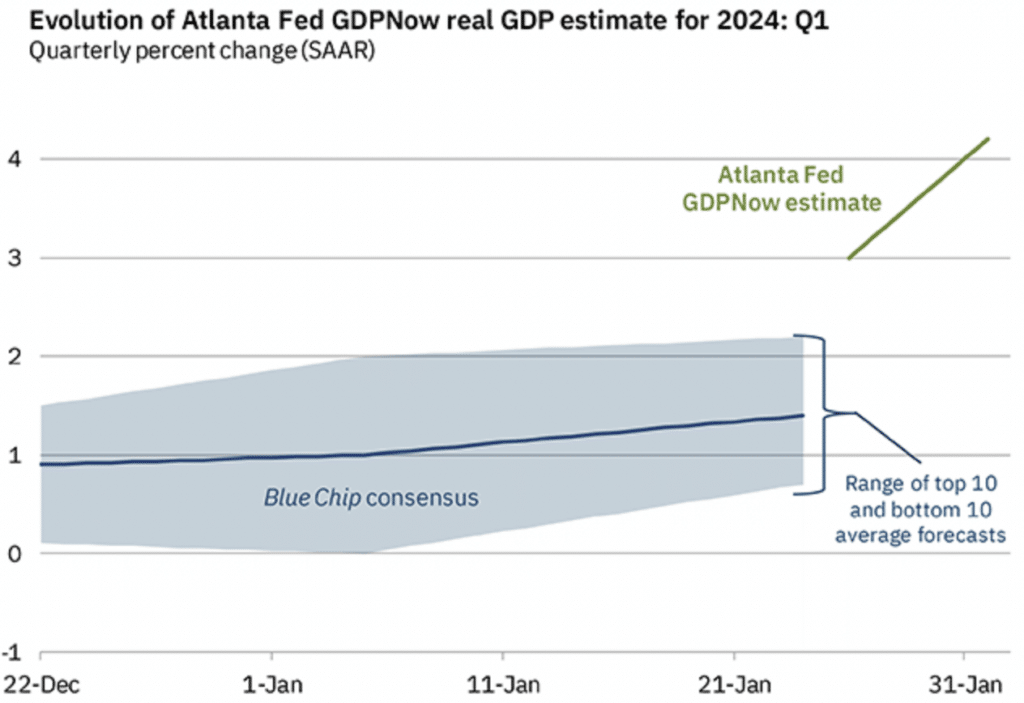 Agora, por exemplo, com a projeção do modelo GDPNow indicando um crescimento real do PIB de 4,2% no primeiro trimestre de 2024, acima dos 3,0% estimados em janeiro, a perspectiva de manutenção da política monetária atual se fortalece, contrariando as expectativas de um alívio iminente na política monetária.
