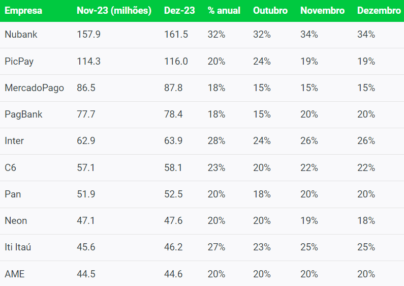 O Nubank lidera o ranking com a maior base de usuários, contabilizando 58 milhões de usuários ativos, o que representa cerca de um terço da indústria. Em segundo lugar está o PicPay, com 24 milhões de usuários.