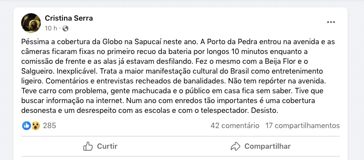 No último domingo, dia 11, a ex-repórter da Globo, Cristina Serra, expressou críticas à cobertura feita pela emissora durante o primeiro dia de desfiles do Grupo Especial. Sua manifestação ocorreu por meio de uma plataforma de rede social.