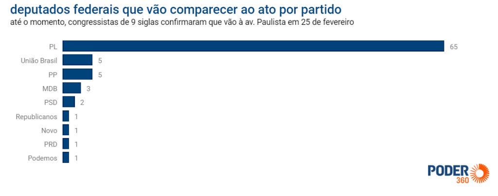 A convocação para o evento liderado pelo ex-presidente Jair Bolsonaro (PL), marcado para o domingo (25 de fevereiro de 2024) na Avenida Paulista, em São Paulo, conta com a confirmação de pelo menos 84 deputados federais, o que representa cerca de 16% da composição da Câmara, de acordo com uma lista que tem circulado em grupos de WhatsApp do Partido Liberal. Além dos deputados, governadores, senadores, deputados estaduais e outras figuras públicas alinhadas à direita também confirmaram presença.