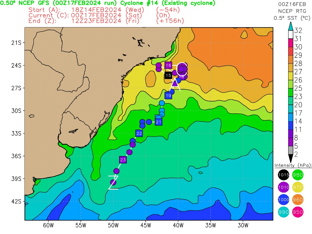 As projeções de trajetória com base nessas rodadas dos modelos GFS (Estados Unidos), NAVGEN (Marinha dos Estados Unidos), UKMET (Reino Unido), ECMWF (Centro Meteorológico Europeu) e CMC (Canadá) mostram um deslocamento para o sul a uma grande distância da costa.