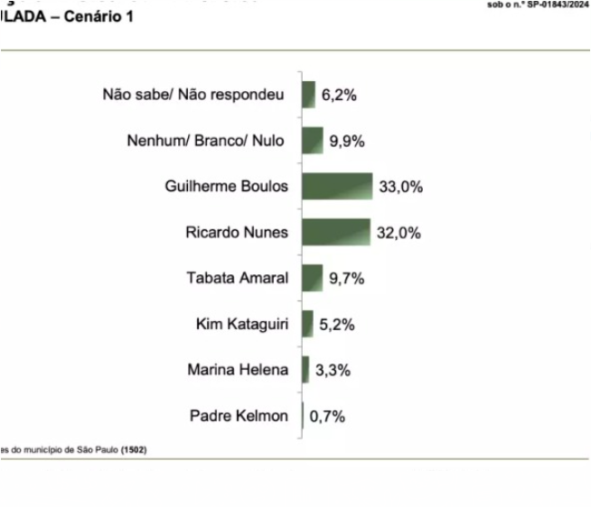O levantamento apontou um empate técnico entre Boulos e Nunes, com o psolista ligeiramente à frente com 33% das intenções de voto, enquanto Nunes obteve 32%. Este último, vale ressaltar, é o atual prefeito da cidade.