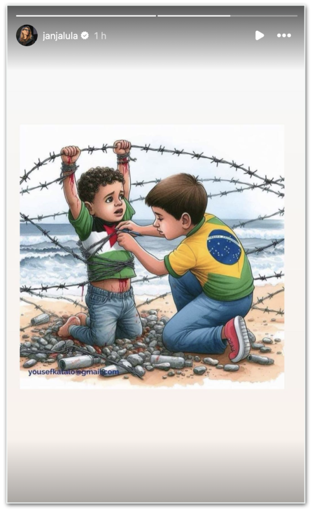 A primeira-dama Janja Lula da Silva compartilhou nesta 2ª feira (19.fev.2024) em seu perfil no Instagram um desenho de uma criança brasileira “resgatando” uma criança palestina.