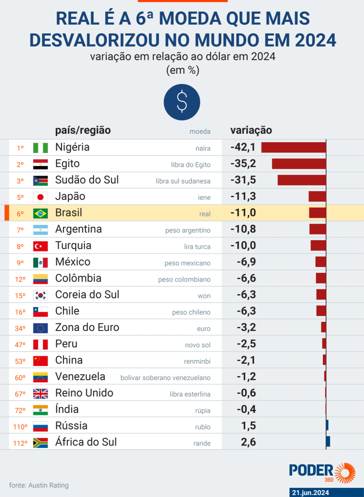 O real foi a 6ª moeda que mais se desvalorizou no mundo em relação ao dólar em 2024. A queda, de 11%, só não foi pior que a das moedas de Nigéria (-42,1%), Egito (-35,2%), Sudão do Sul (-31,5%), Gana (-20,9%) e Japão (-11,3%). O levantamento foi feito pelo economista-chefe da Austin Rating, Alex Agostini, a pedido do Poder360.