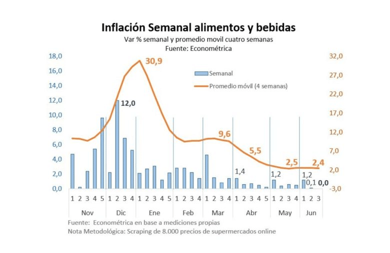 A inflação geral de junho está atualmente em 2,4%, com a medição da quarta semana ainda pendente. A estabilização dos preços nas últimas duas semanas (0,1% e 0,0%) reflete a efetividade das políticas econômicas implementadas pelo governo de Milei. Desde que assumiu o cargo, Milei realizou o maior ajuste fiscal da história da Argentina, eliminando o déficit fiscal e interrompendo a emissão de moeda.