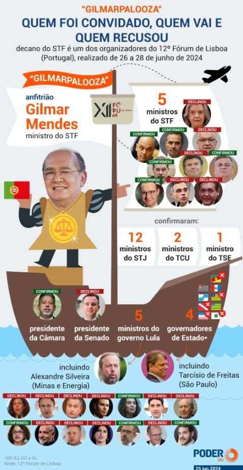 Como anfitrião do evento em Lisboa, Gilmar convidou todos os ministros do STF, e a resposta foi dividida da seguinte forma: