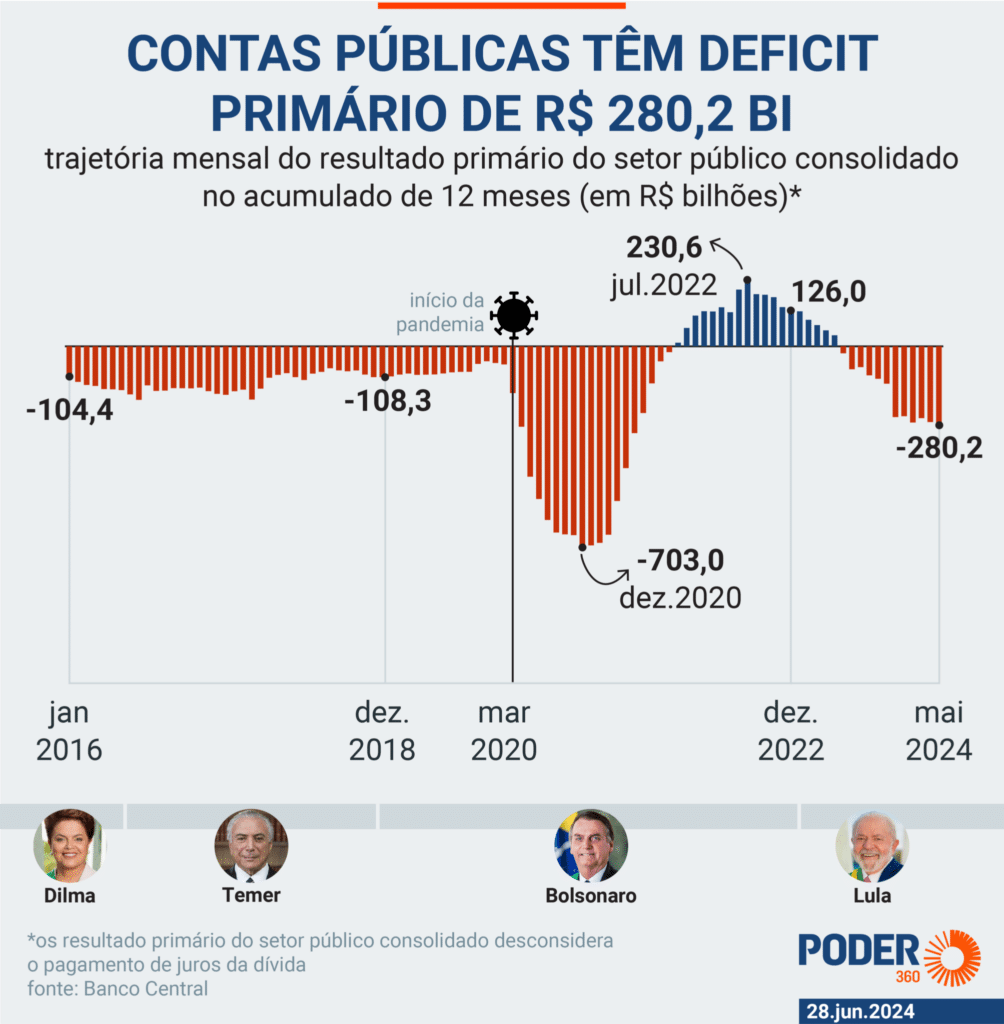 O deficit primário, que exclui o pagamento de juros da dívida, alcançou R$ 280,2 bilhões no acumulado de 12 meses, o maior valor desde julho de 2021 (quando totalizou R$ 305,5 bilhões). O Banco Central divulgou esses dados em seu relatório de estatísticas fiscais nesta sexta-feira, 28 de junho de 2024.