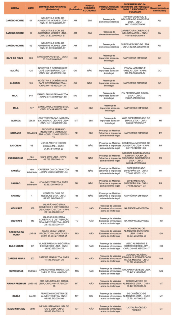 De acordo com o Mapa, a operação que identificou as marcas impróprias ocorreu entre 18 e 28 de março, durante a qual 168 amostras de café foram coletadas em todo o país. Dessas, 14 foram consideradas inadequadas para consumo.