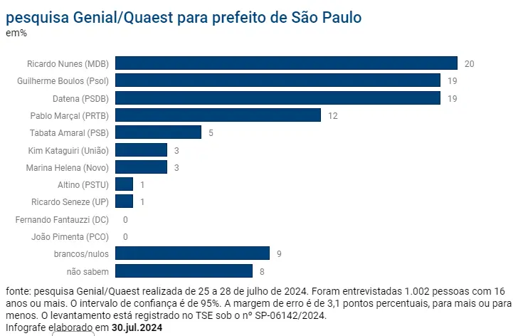 Levantamento divulgado pela Genial/Quaest nesta 3ª feira (30.jul.2024) mostra que, na disputa pela Prefeitura de São Paulo, o atual prefeito, Ricardo Nunes (MDB), e os candidatos Guilherme Boulos (Psol) e José Luiz Datena (PSDB) estão empatados. Nunes aparece com 20% e Boulos e Datena com 19% cada um.