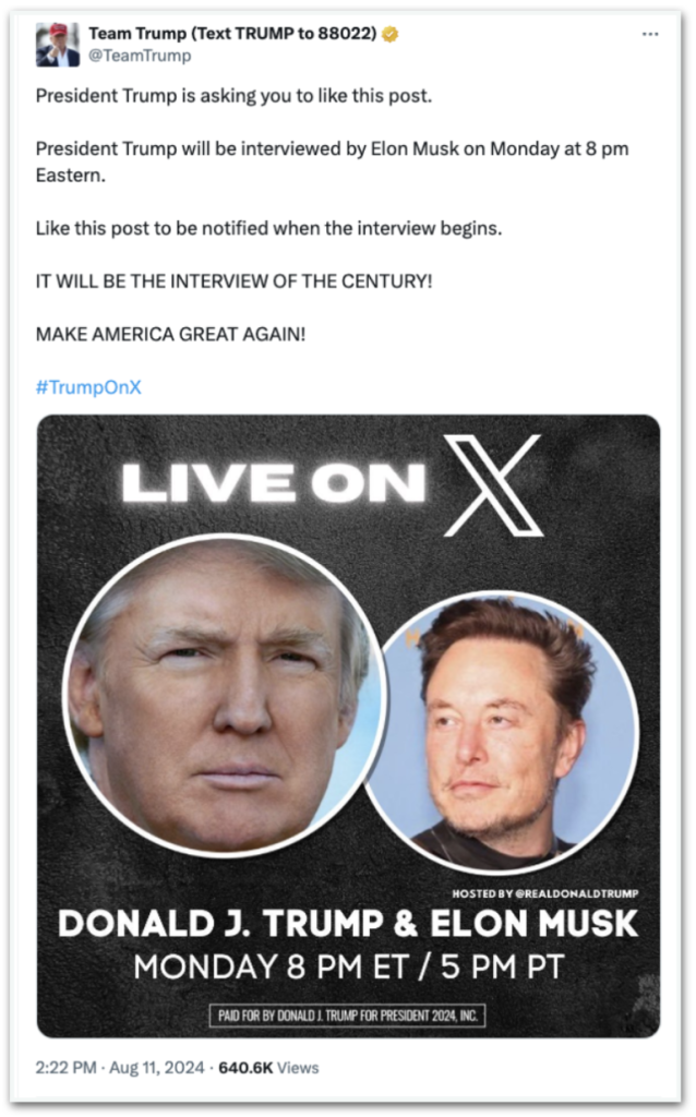 O perfil da campanha do republicano afirmou que “será a entrevista do século”. No domingo (11.ago), a página publicou: “Curta este post para ser avisado quando a entrevista começar. Será a entrevista do século! Faça a América grande de novo!”.