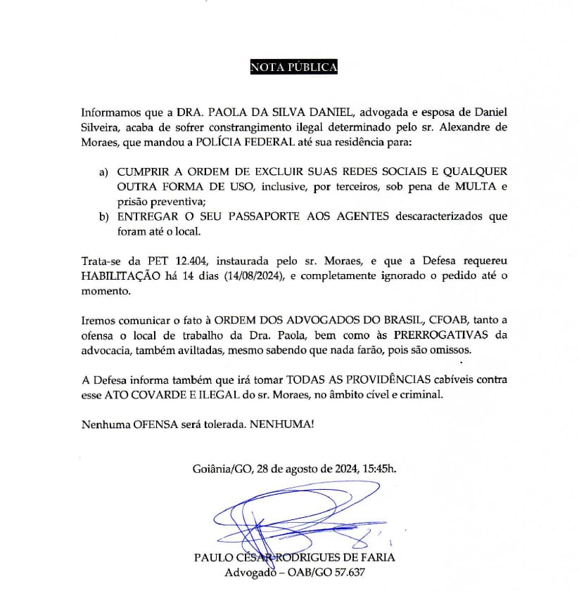 Em nota, a defesa classificou o episódio como “constrangimento ilegal”. “Iremos comunicar o fato à Ordem dos Advogados do Brasil, tanto a ofensa ao local de trabalho de Paola, bem como às suas prerrogativas da advocacia, também aviltadas, mesmo sabendo que nada farão, pois são omissos”, informou Paulo Faria, que defende Silveira, em nota enviada a Oeste.