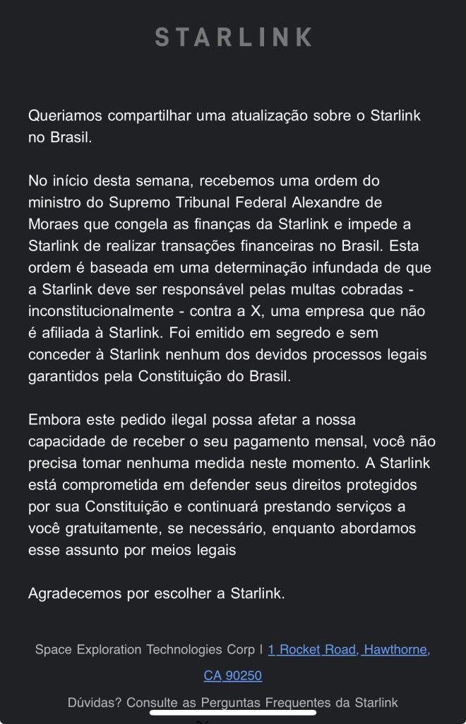 A Starlink, que hoje conecta mais de 250 mil clientes no Brasil, incluindo pequenas empresas, escolas e socorristas em locais que vão desde a Amazônia até o Rio de Janeiro, destacou em sua declaração que, embora essa ordem ilegal possa impactar sua capacidade de receber pagamentos mensais, a empresa está comprometida em defender os direitos de seus clientes e continuará prestando serviços – gratuitamente, se necessário – enquanto busca resolver a questão pelos meios legais disponíveis.