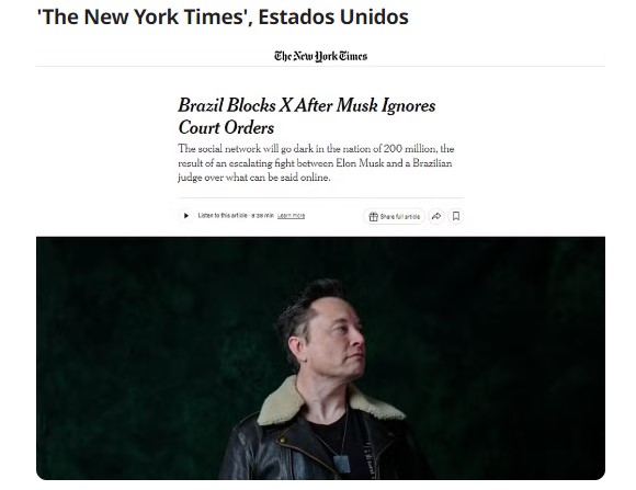 O The New York Times destacou que o bloqueio afetará “uma nação de 200 milhões” de habitantes, em alusão à população brasileira. O jornal norte-americano ainda informou sobre a disputa entre o empresário Elon Musk e Alexandre Moraes. O El País, da Espanha, relatou que a rede social está “com as horas contadas” no Brasil.