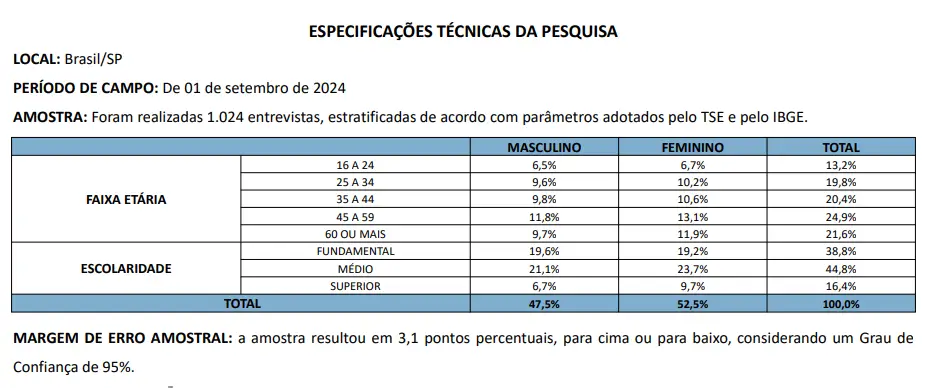 A pesquisa foi realizada em todo o Brasil com 1.024 entrevistas, e a margem de erro é de 3,1 pontos percentuais para mais ou para menos, com 95% de confiança. O público entrevistado foi estratificado por gênero, faixa etária e nível de escolaridade.