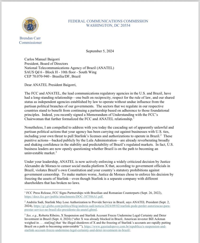 O chefe da Comissão Federal de Comunicação dos Estados Unidos, Brendan Carr, enviou uma carta ao presidente da Agência Nacional de Telecomunicações (Anatel), Carlos Baigorri, para repudiar a decisão do órgão regulador de acatar as ordens do ministro Alexandre de Moraes, do Supremo Tribunal Federal (STF), que culminaram no bloqueio do Twitter/X no Brasil.