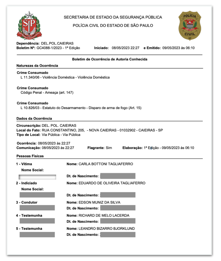 O escrivão Leandro Bjorklund é amigo próximo de Tagliaferro. Ele foi testemunha de defesa quando o ex-assessor de Moraes foi preso por violência doméstica contra sua ex-mulher em maio de 2023. Leia abaixo um trecho do boletim de ocorrência: