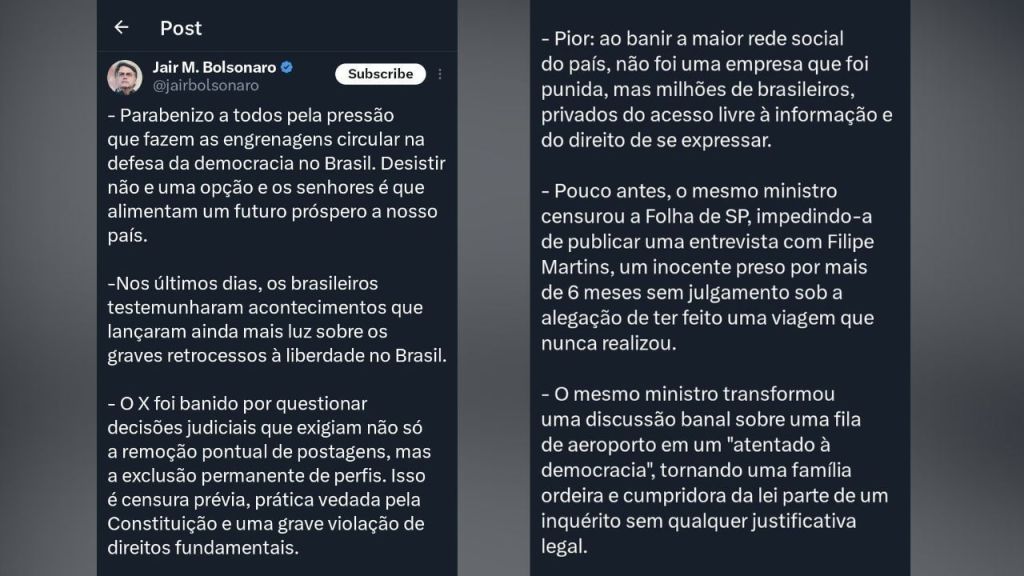 Sem citar o ministro Alexandre de Moraes, do Supremo Tribunal Federal (STF), Bolsonaro afirmou que a decisão de bloquear o X foi “censura prévia, prática vedada pela Constituição e uma grave violação de direitos fundamentais”.
