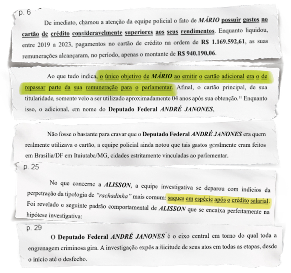 Do começo do primeiro mandato de Janones na Câmara até meados de 2023, Silva Júnior pagou 1 169 592 reais em faturas de cartão de crédito, enquanto declarou 940 190 reais de renda. Segundo a polícia, os gastos coincidem com agendas de Janones e lugares em que o parlamentar esteve. Além disso, parte dessas despesas teria sido reembolsada pela Câmara. Semanas antes de Camargos começar os saques e meses antes de Silva Júnior emitir o cartão em nome de Janones, houve uma reunião na qual o deputado pediu aos assessores que devolvessem parte dos salários para custear despesas das eleições. A gravação, revelada em outubro de 2023, mostra que haveria, de um lado, a “coação” praticada pelo chefe e, de outro, os servidores entregando a ele parte de seus salários. Quando o caso veio à tona, Janones admitiu a autoria do áudio, abriu mão de seus sigilos e bateu no peito para afirmar a sua inocência.