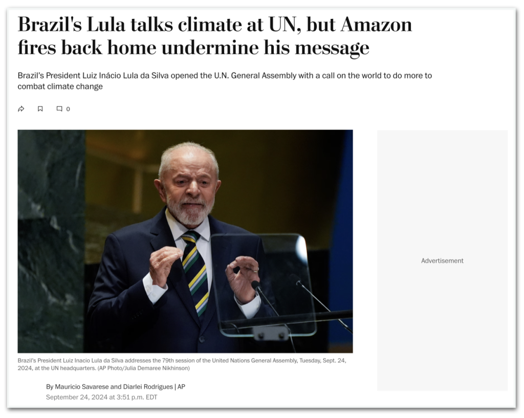 A edição impressa do Washington Post desta 4ª feira (25.set) traz uma reportagem sobre o discurso do presidente dos EUA, Joe Biden (Partido Democrata), na ONU. Não faz menção a Lula ou ao Brasil. O jornal publicou em seu site, na 3ª feira (24.set), um texto produzido pela agência de notícias Associated Press com o seguinte título: “Lula fala sobre clima na ONU, mas incêndios na Amazônia minam sua mensagem”.