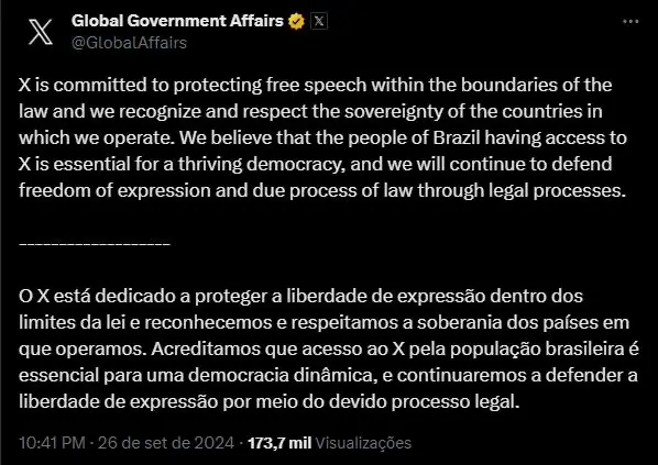 “O X está dedicado a proteger a liberdade de expressão dentro dos limites da lei e reconhecemos e respeitamos a soberania dos países em que operamos”, postou a companhia. “Acreditamos que acesso ao X pela população brasileira é essencial para uma democracia dinâmica, e continuaremos a defender a liberdade de expressão por meio do devido processo legal”.