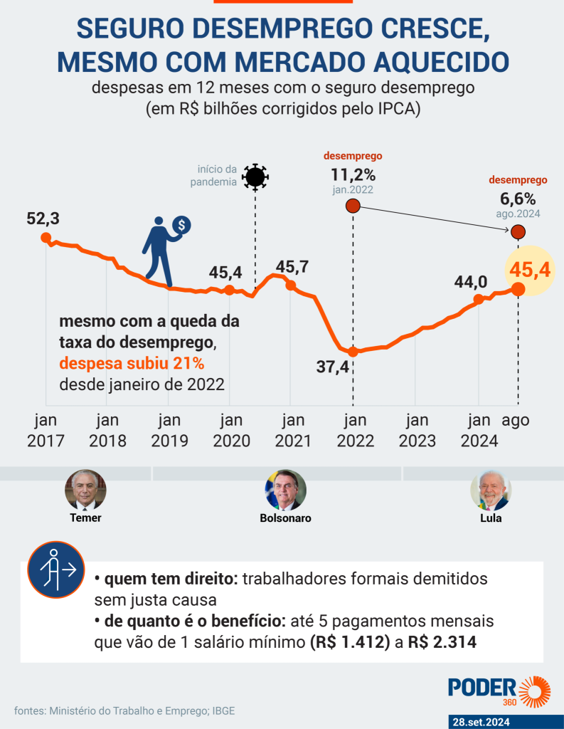 A despesa acumulada em 12 meses com o seguro-desemprego passou de R$ 37,4 bilhões em janeiro de 2022 para R$ 45,4 bilhões em agosto de 2024, em valores corrigidos pelo IPCA.