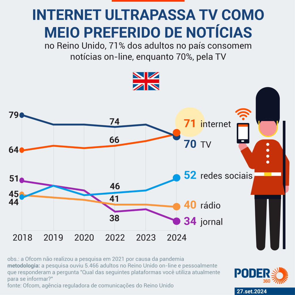 Segundo a Ofcom, 71% dos adultos no Reino Unido consomem notícias pela internet. O valor é 1 p.p. maior que os 70% que consomem notícias pela TV.