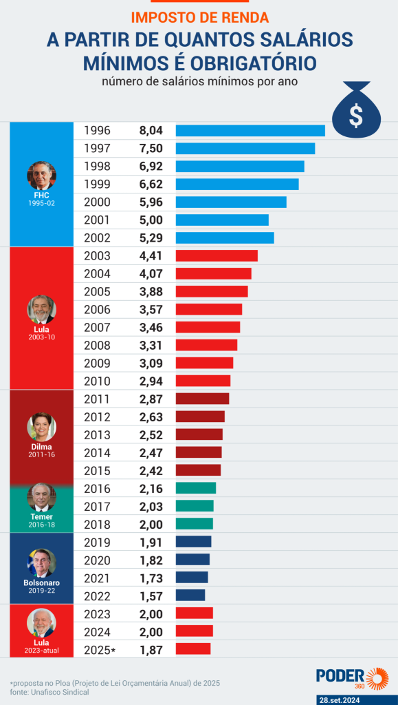 Em 1996, sob governo de Fernando Henrique Cardoso (PSDB), eram necessários 8 salários mínimos para ter que pagar o Imposto de Renda. Com a defasagem da tabela do IRPF, a trajetória foi achatando.