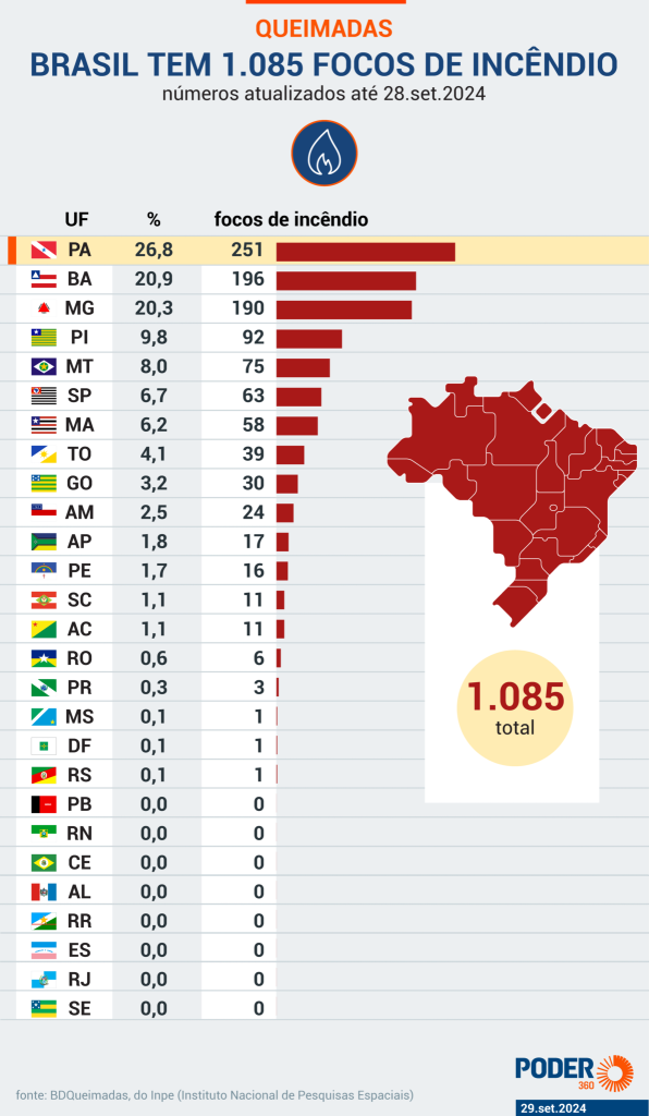 O Brasil registrou 1.085 focos de incêndio no sábado (28.set.2024), segundo dados do BDQueimadas, do Inpe (Instituto Nacional de Pesquisas Espaciais). O país havia registrado uma queda no número de alertas, que foram de 1.374 para 934 focos de 5ª feira (26.set) para 6ª feira (27.set).