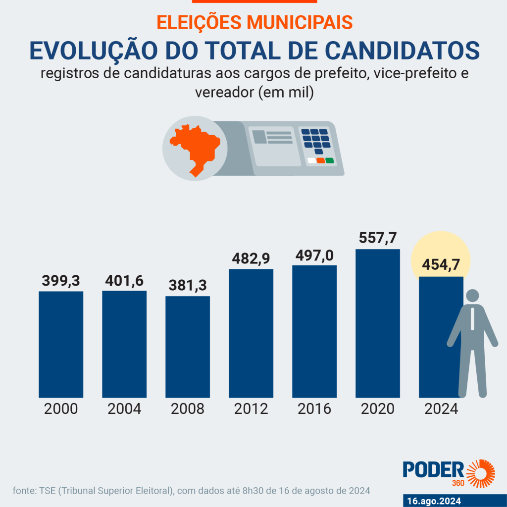 As eleições municipais deste ano têm o menor número de candidatos desde 2008, quando houve 381.327 inscritos. São 454.689 registros em 2024. É uma queda de 18% ante 2020, quando haviam sido 557,7 mil candidaturas. Os dados são do TSE (Tribunal Superior Eleitoral).
