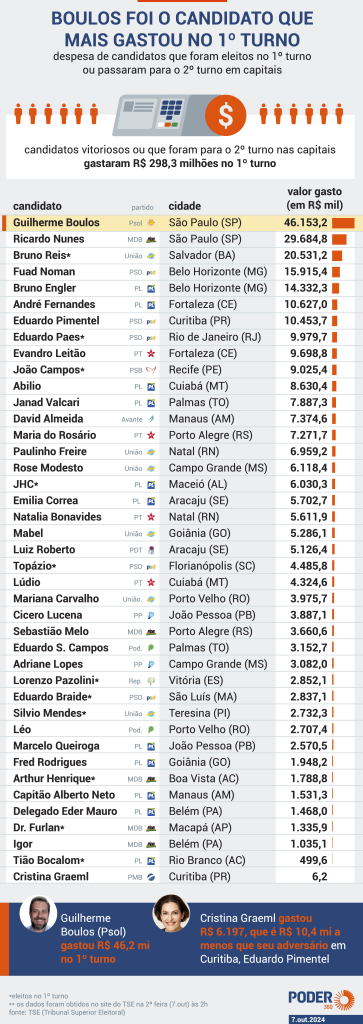 Guilherme Boulos (Psol) foi o que mais gastou no 1º turno entre os candidatos a prefeituras de capitais eleitos e os que vão para o 2º turno. Desembolsou R$ 46,15 milhões e disputará o cargo de prefeito com Ricardo Nunes (MDB), que foi o 2º que mais teve despesa na campanha eleitoral (R$ 29,68 milhões).