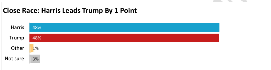 Com apenas quatro dias restantes, Trump e Harris estão empatados em 48%, enquanto os indecisos tomam suas decisões finais. Este embate acirrado prepara o cenário para um resultado extremamente apertado. Nossa última pesquisa, com 1.265 eleitores prováveis (margem de erro de ±2,7 pontos) realizada entre 28 e 30 de outubro, captura uma disputa dentro de uma faixa estreita de quatro pontos, variando de Trump +2 a Harris +2. Nos dias finais, cada movimento pode definir o futuro da nação.