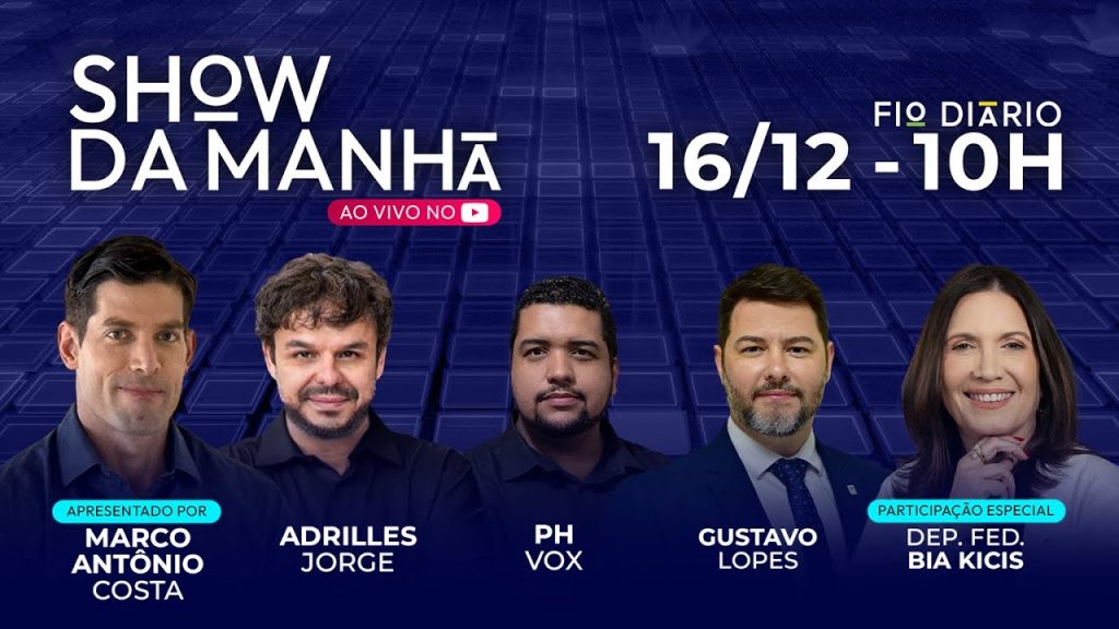 Apresentado por Marco Antônio Costa, com os comentários de Adrilles. Convidados de hoje: PHVox e Gustavo Lopes. Participação especial: Dep. Fed. Bia Kicis. O Show da Manhã vai ao ar de segunda a sexta, das 10h às 12h.