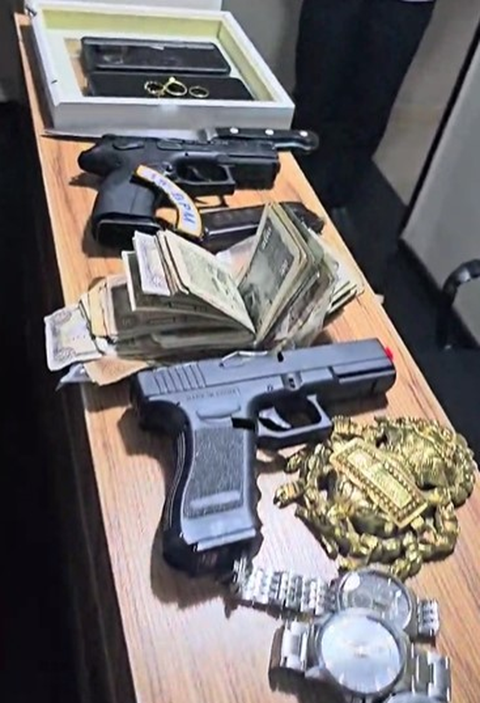 Com eles, os agentes apreenderam duas réplicas de arma de fogo, uma faca e diversos pertences dos moradores, entre eles, joias, relógios, cartões de crédito e uma quantia em dinheiro.