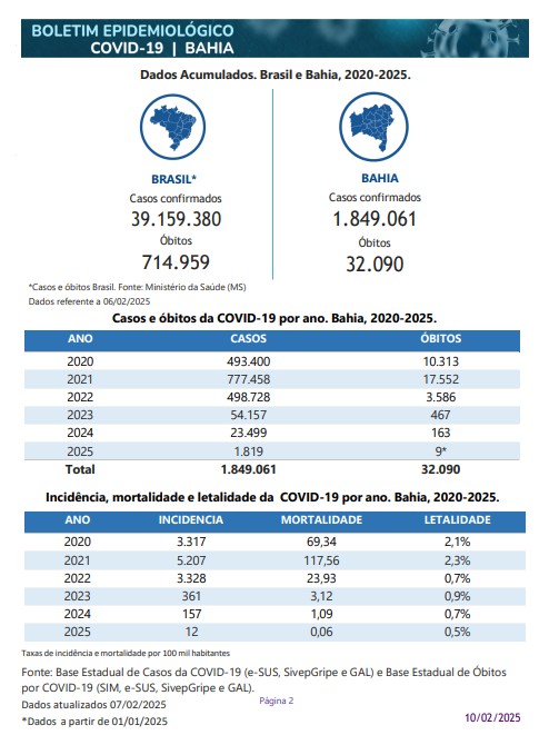 De acordo com último boletim epidemiológico, publicado pela Secretaria de Saúde do Estado (Sesab) na última segunda-feira (10), a Bahia registrou 1.819 novos casos da doença até 6 de fevereiro. Desde o primeiro dia de 2025, nove mortes foram contabilizadas, sendo cinco em Salvador.