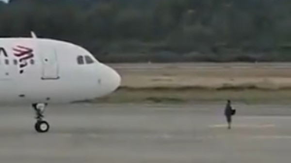 Um vídeo mostra o exato momento em que um funcionário vai até o local e ordena que ele saia da pista. Logo em seguida, guardas do terminal aparecem para retirá-lo.