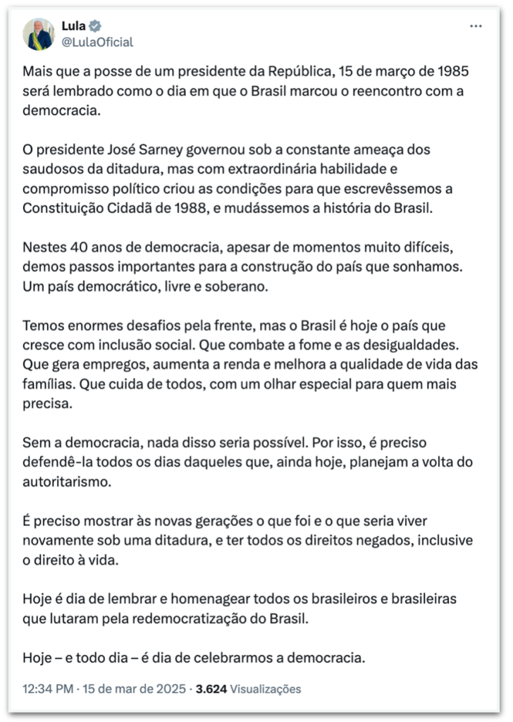 O presidente Luiz Inácio Lula da Silva (PT) celebrou neste sábado (15.mar.2025) os 40 anos da redemocratização no Brasil. Em publicação no X (ex-Twitter), o chefe do Executivo elogiou o trabalho do ex-presidente José Sarney, 1º civil a assumir o governo depois da ditadura militar (1064-1985) e disse ser necessário proteger a democracia dos que “planejam a volta do autoritarismo”.