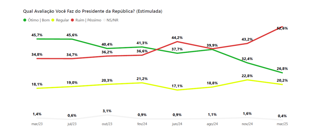 Esta é a primeira vez na série da pesquisa que a avaliação negativa superou a marca de 50%, enquanto a positiva ficou abaixo de 30%