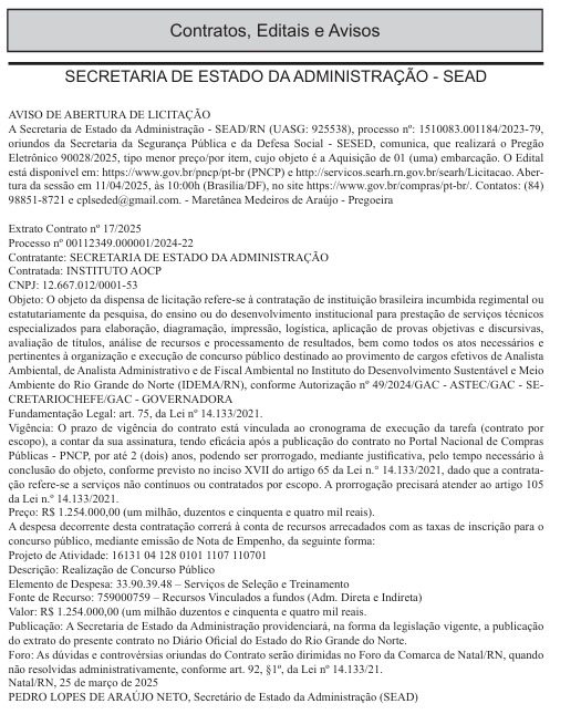 Um novo concurso público deverá ser realizado ainda este ano com vagas para o Governo do Rio Grande do Norte, com 180 vagas. O ClickPB apurou que o extrato de contrato da banca organizadora do certame foi publicado na edição desta quarta-feira (26) do Diário Oficial do Estado (DOE-RN).