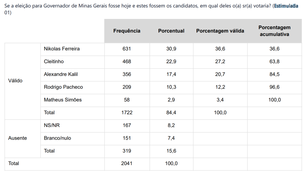Pesquisa da Veritá divulgada neste sábado (29.mar.2024) mostra que o deputado federal Nikolas Ferreira (PL-MG) lideraria a intenção de votos para o governo de Minas Gerais com 30% se as eleições fossem hoje. Em entrevistas a jornalistas, o congressista já afirmou que não descarta a possibilidade de disputar o cargo em 2026.