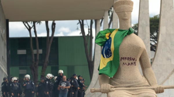 Débora, que foi fotografada pichando a estátua durante os atos de 8 de janeiro, escreveu a frase “Perdeu, mané”, dita pelo ministro Luís Roberto Barroso a um manifestante bolsonarista em Nova York, em 2022.