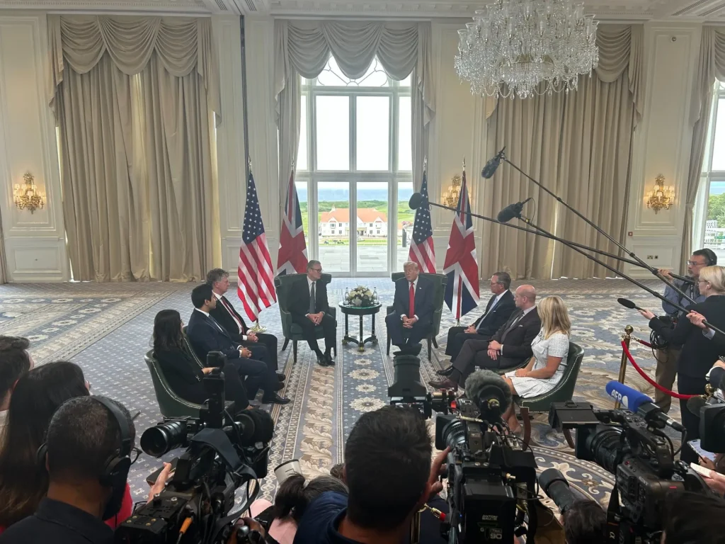 Em uma coletiva de imprensa cordial com o primeiro-ministro britânico em seu resort de golfe Turnberry na Escócia, a questão da Lei de Segurança Online — aprovada pelo Partido Conservador e aplicada pelo Partido Trabalhista — jogou uma chave inglesa nos trabalhos.