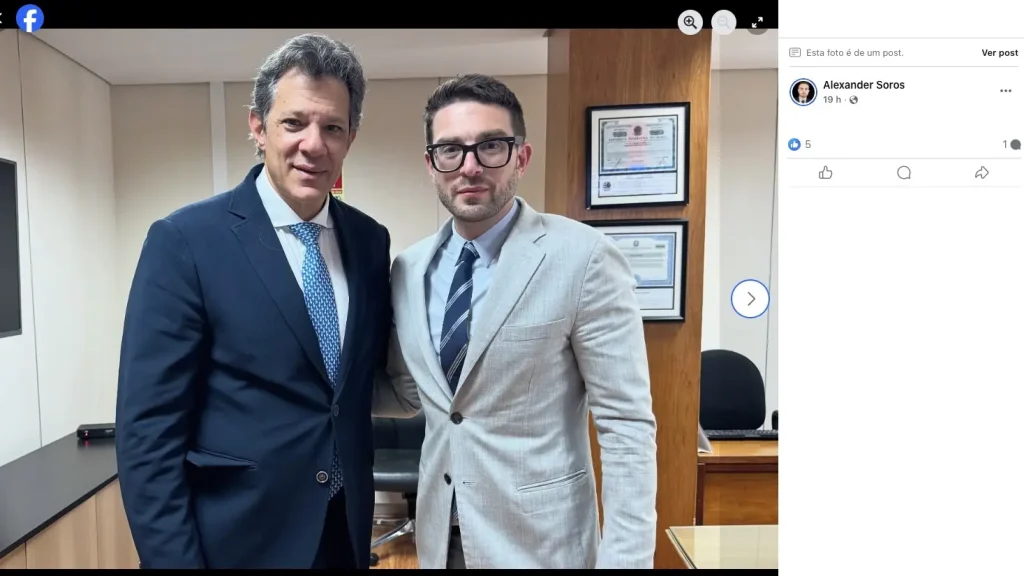 Alexander Soros, presidente da Open Society Foundation e filho do investidor George Soros, reuniu-se com o ministro da Fazenda, Fernando Haddad (PT-SP), na terça-feira (19), em Brasília. Oficialmente, a pauta do encontro foram os preparativos para a Conferência das Nações Unidas sobre Mudança do Clima, a COP 30, que ocorrerá em novembro, em Belém, Pará, e o fortalecimento da agenda climática do país.