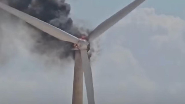 Nas imagens registradas pelos moradores, é possível ver a torre eólica em funcionamento durante o incêndio. Em seguida, duas pás se desprendem e caem.