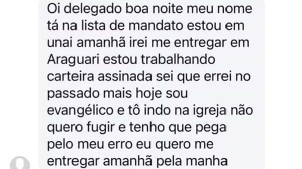 Uma situação incomum surpreendeu a Polícia Civil de Araguari (MG) na última quinta-feira (21/8). Um dos foragidos da terceira fase da Operação Aqueronte, que investiga facções criminosas atuantes no Triângulo Mineiro, decidiu se entregar voluntariamente após enviar uma mensagem direta ao delegado Fernando Storti por uma rede social.No texto, o jovem de 23 anos disse estar arrependido, relatou que havia se convertido à religião evangélica e afirmou que não pretendia mais fugir: “Hoje sou evangélico e tô indo na igreja. Tenho que pagar pelo meu erro, eu quero me entregar amanhã pela manhã”, escreveu.
