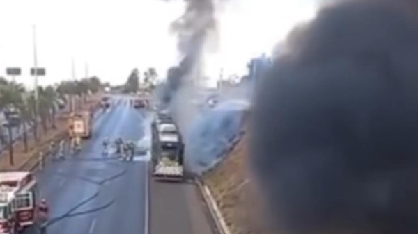 Um caminhão-cegonha que transportava 11 veículos pegou fogo na tarde desta quinta-feira (5/9), na Epia Norte, próximo ao viaduto do Colorado, na BR-020. Pelo menos três carros foram atingidos pelas chamas. O motorista não se feriu.